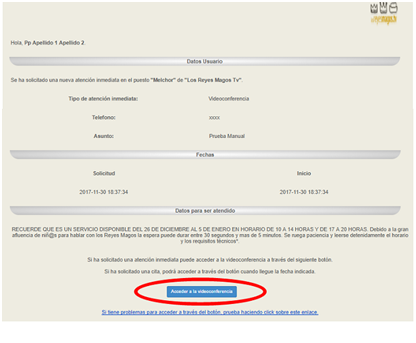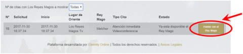 - Cuando el Rey Mago está “on line” esperando al usuario para hablar con él, el estado de la cita se cambia a “Ya está disponible el Rey Mago”. En ese momento, hay que pinchar en el botón “Hablar con el Rey Mago”: