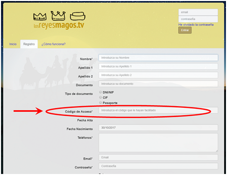 - Al registrarse hay que tener cuidado con los datos obligatorios (marcados con un asterisco) y, principalmente con el código de acceso “navidadesensoto” (marcado con un círculo rojo en la imagen siguiente):